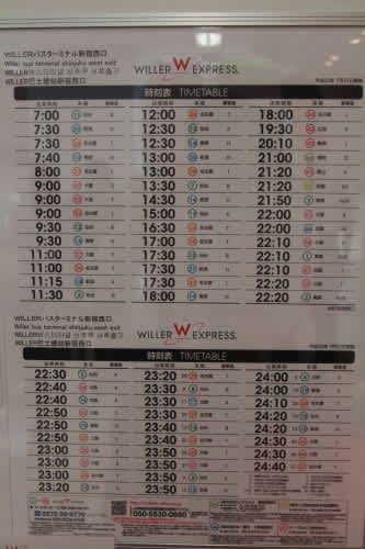 WILLERバスターミナル新宿西口の時刻表。(2013年7月31日現在のもの)