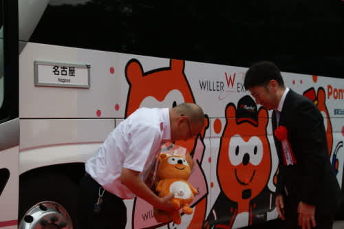8時。「Ponta EXPRESS」の出発式。村瀬社長の安全運行をお願いする言葉と共に、名古屋駅太閤通口行きベイラインエクスプレスの運転手さんへ、ポンタくん人形の贈呈が行われました。
